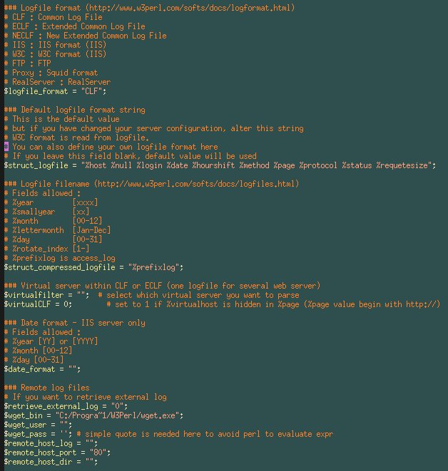 - $logfile_formatIl faut ici définir quels types de fichier de configuration votre serveur utilise. Si vous n'y connaissez rien dans ce domaine, il suffit d'extraire quelques lignes de votre fichier de log et de le comparer avec ces quelques lignes. Les personnes utilisant un serveur IIS sous Windows ont le choix entre :
